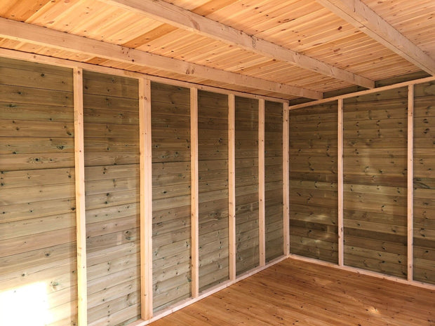 Constructed using sturdy 50mm x 50mm frames and 22mm tongue and groove pressure treated tanalised loglap cladding.