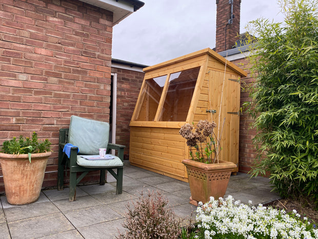 The Potting Shed is a great building for the gardener who has a limited space. With its large sloping glass front, it maximises the sunlight into the building giving seedlings and plants the best opportunity to establish themselves before going into the garden.